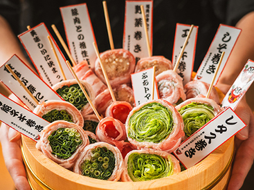 見ているだけでも心が躍る串専門店!定番の焼き鳥や豚、名物の野菜巻き串までご用意!自慢の野菜串は、20種類以上の野菜や変わり種の具材を豚バラで丁寧に1本1本巻き炭火でじっくりと焼き上げます。